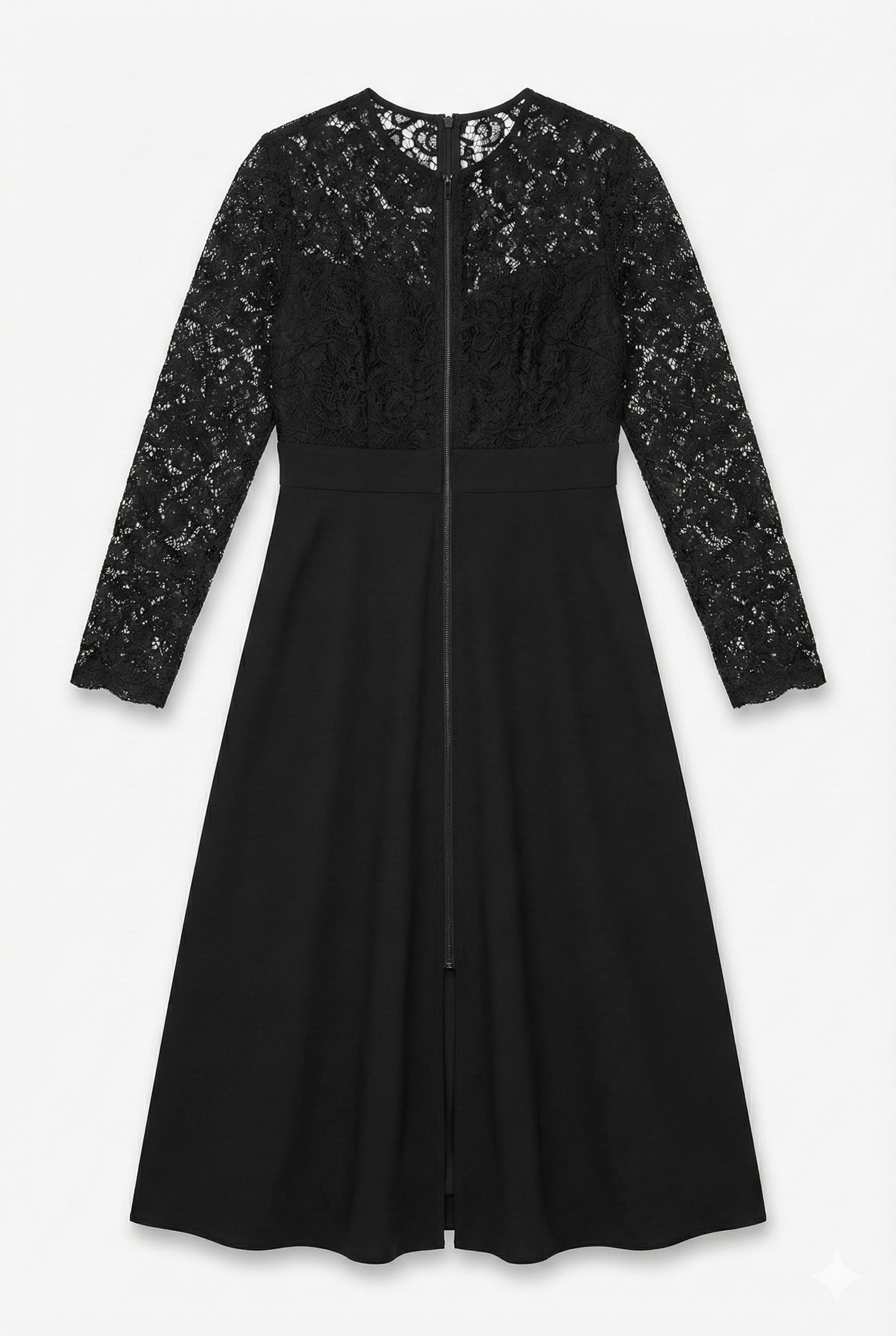 Elegant black dress from Sandro Paris featuring a sheer lace bodice with intricate floral and geometric patterns, paired with a solid black skirt for a sophisticated contrast. Designed with a fitted waist and zip-front closure, this piece blends femininity with modern tailoring. Perfect for evening dinners, cocktail parties, or formal gatherings. Crafted with attention to detail, the lace overlay creates a striking look while the solid bottom ensures comfort and ease of wear.