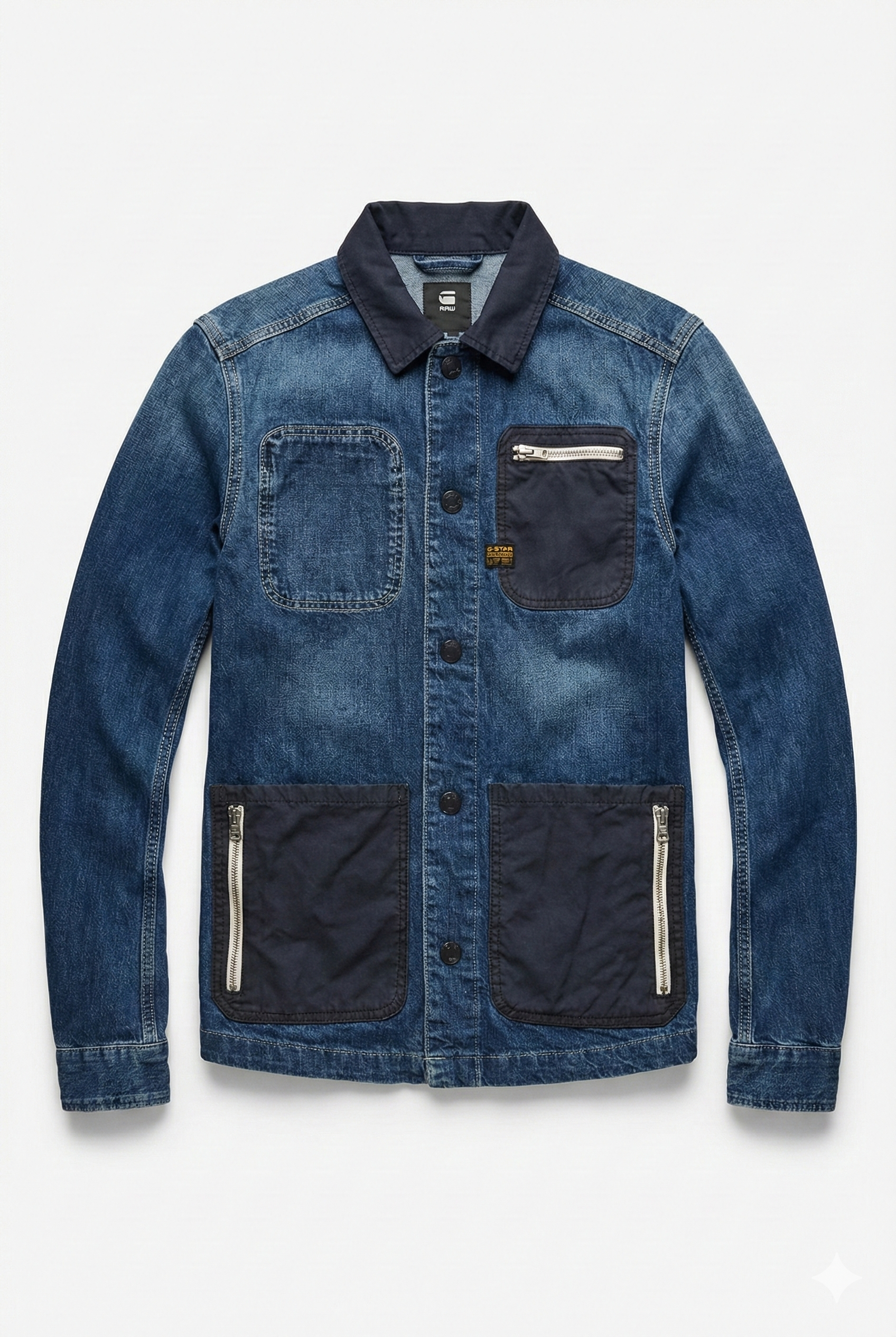 This G-Star Originals denim jacket combines rugged blue cotton denim with utilitarian details for a modern workwear-inspired look. It features a button-down front, pointed collar in a darker contrast fabric, and multiple functional pockets, including large black contrast patch pockets with zipper accents. The back is embossed with a tonal G-Star logo, adding subtle branding. Crafted from a cotton-polyester blend, the jacket is durable yet comfortable, ideal for casual layering across seasons. Care instructions indicate machine wash with similar colors. A versatile outerwear piece that balances utility and style.