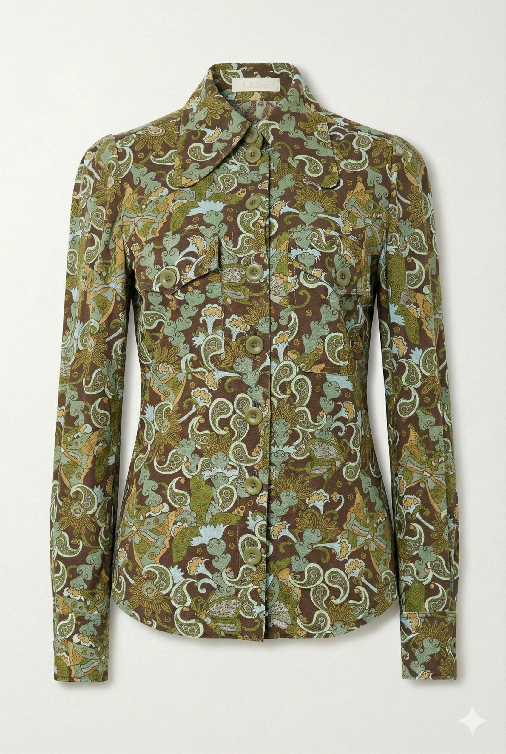 This blouse from Chloé showcases a striking multicolor paisley print in brown, green, and light blue tones. Crafted with precision in Slovakia, the piece features a pointed collar, button-down closure, flap chest pockets, and long sleeves with button cuffs. Its bold print and structured details create a distinctive silhouette suitable for both chic daytime styling and elevated evening wear. The size tag indicates EU-34 (equivalent to XS). Care label suggests professional dry clean. A refined designer piece that adds a vibrant yet sophisticated touch to any wardrobe.